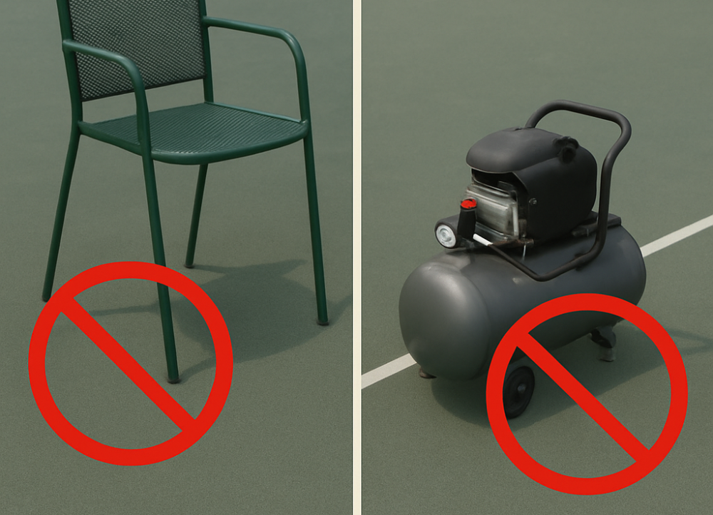 Umpire’s chairs, garden seats and other tennis tournament staples should never be placed directly onto the playing surface, boards or pads should be placed under the legs to spread any point load.
