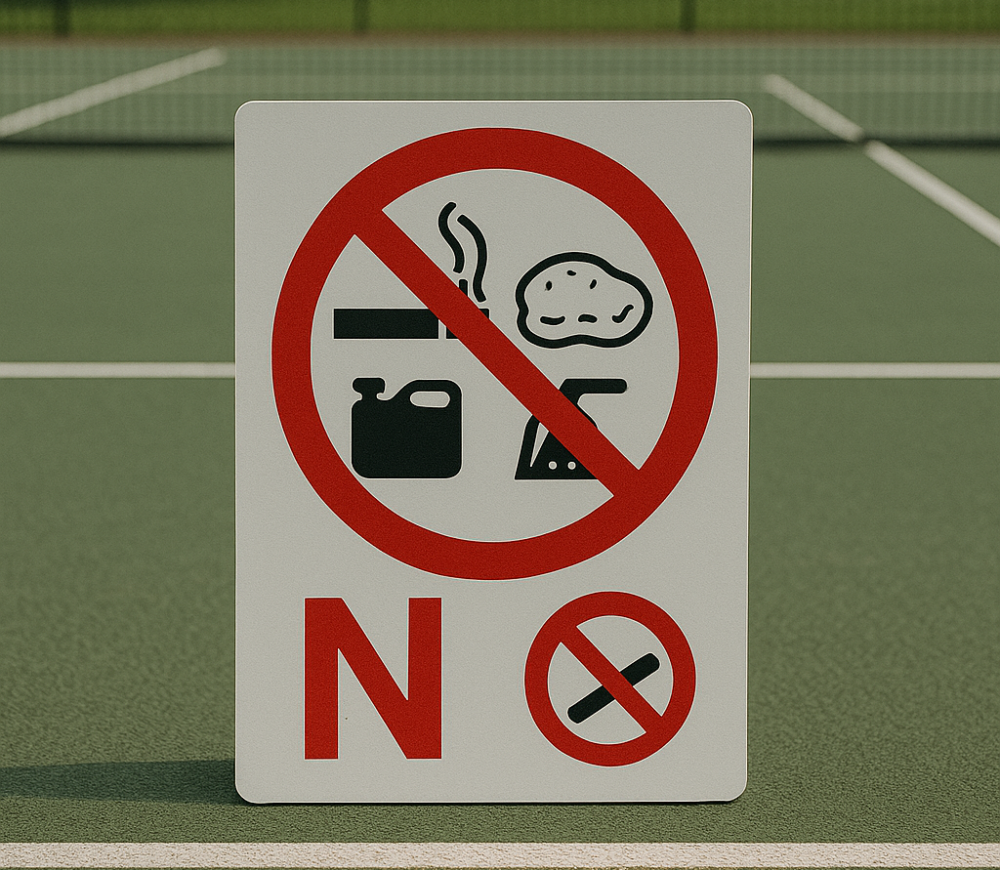 It is crucial that you eliminate any contamination from settling on the surface of the tennis court, this includes cigarette butts, chewing gum, petrol and oils. We advise that you keep a sign prohibiting these items from the tennis court to prolong the life of the court’s surface.