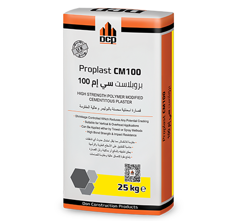 Proplast CM100 is a polymer modifi ed, ready to use cementitious plaster. Proplast CM100 is composed of a blend of cement, sand, limestone, dry powders aggregates, selected polymers and fi bers which when mixed with water produces a thixotropic mortar suitable for plastering on vertical and overhead surfaces.