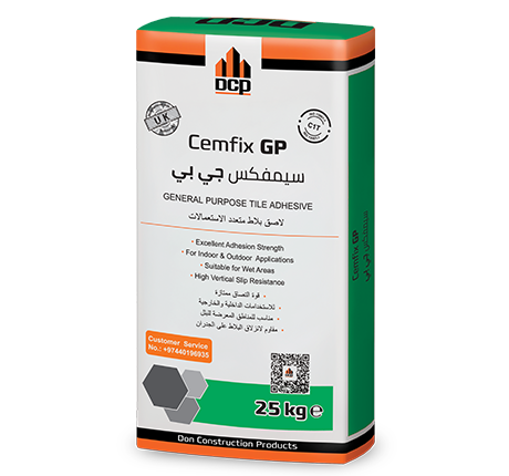 Cemfix GP is supplied in the form of white or grey powder that is ready to use with the addition of water to provide a good workable and easy to apply tile adhesive. Since it has excellent slip resistance properties, Cemfix GP is suitable to be applied vertically without sagging and with no need for using spacers for normal sized tiles. Cemfi x GP can be used in wet or dry conditions.