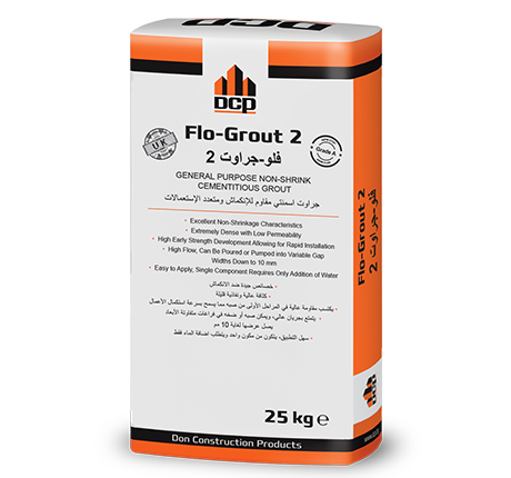 Flo-Grout 2 is pre-mixed, pre-packed chloride free cementitious grout. It contains cement, selected additives, well graded, and non-reactive aggregates and is designed to give excellent flow properties, shrinkage compensation, frost resistance, and high compressive strength.